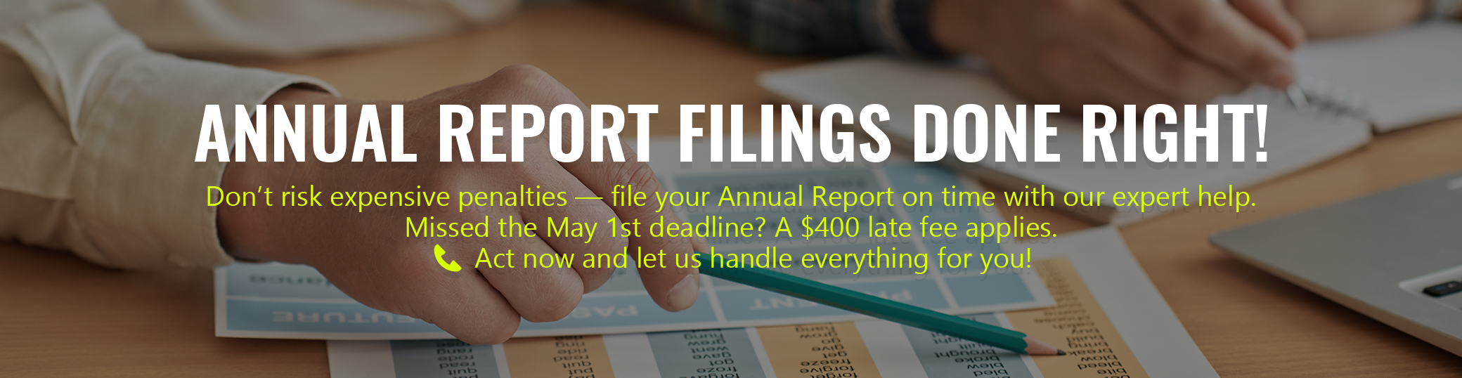 - Annual Report Filings: If the May 1st deadline has passed, you can still file your report by paying the State’s $400 late fee. Act fast—businesses not filed by mid-September risk being administratively dissolved. Need reinstatement? We handle that too.