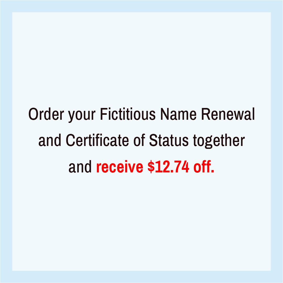 Order your Fictitious Name Renewal and Certificate of Status together and receive $12.74 OFF